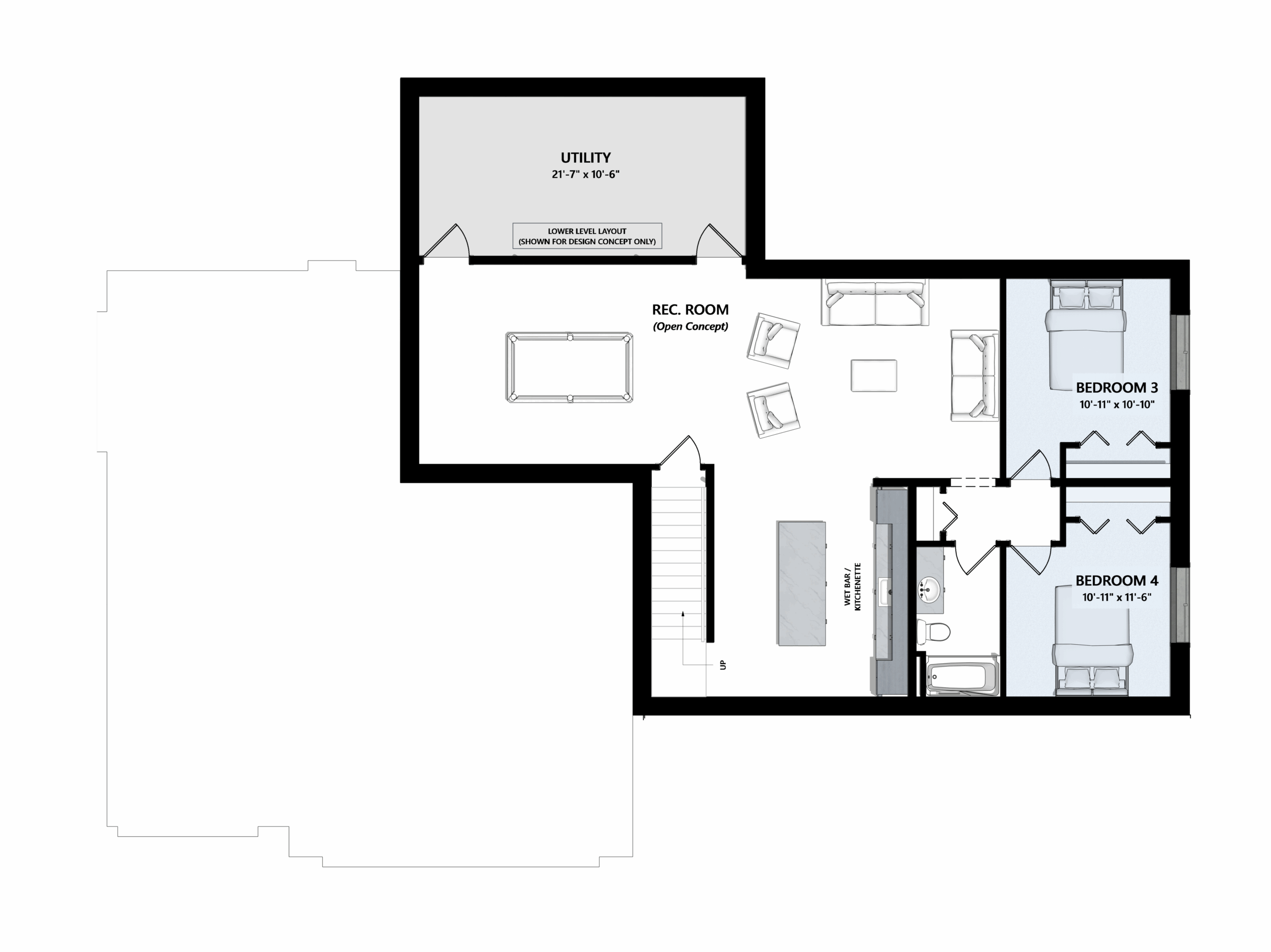 For those who want even more space, an optional finished lower level adds a rec room, wet bar, two additional bedrooms, and a full bathroom - perfect for guests, hobbies, or entertaining.